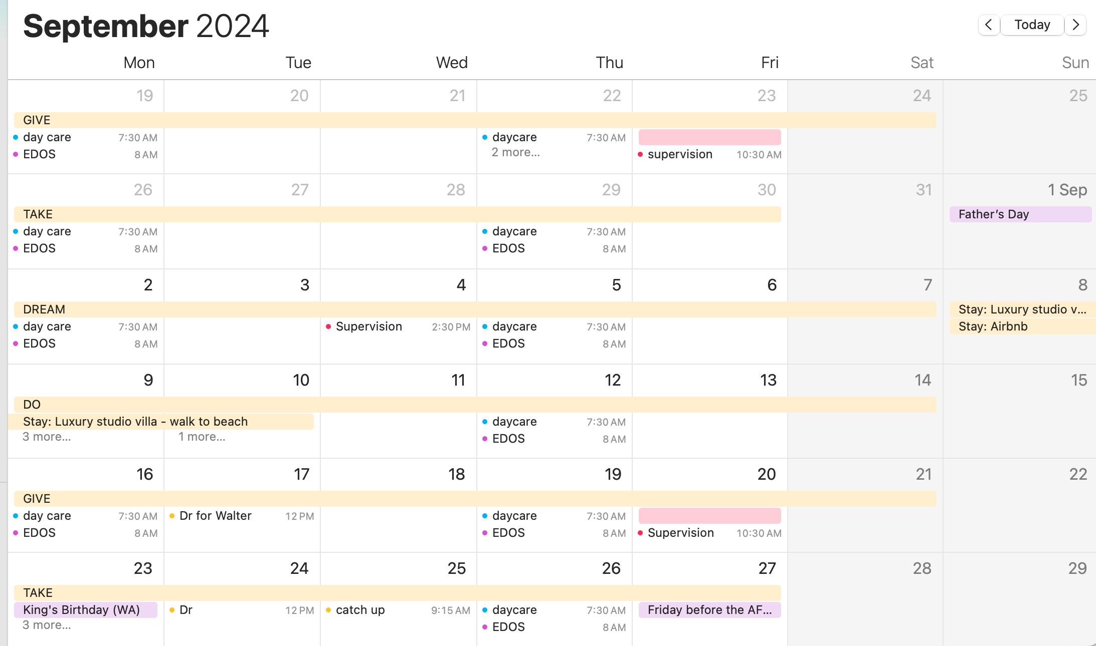 Each week is labeled with one of the four verbs: Dream, Do, Give, Take. It doesn’t mean I live perfectly in sync . Life is full, and parenting a toddler means my energy isn’t always mine to protect. But this simple structure helps me know what I need.